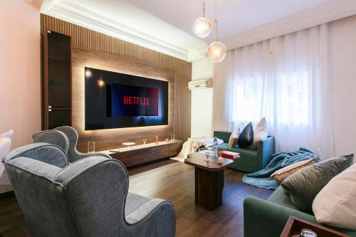 Diese Ferienwohnung mit 2 Schlafzimmern bietet den Gästen Flachbild-TV, eine Klimaanlage und ein Wohnzimmer.