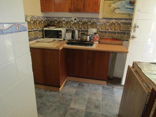 Eine voll ausgestattete Küche mit einer Mikrowelle und einer Kaffeemaschine ist vorhanden.