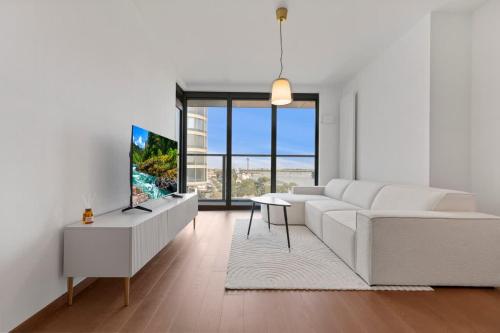 The apartment with a balcony and city views features 1 bedroom, a living room, a flat-screen TV, an equipped kitchen with a dishwasher and an oven, and 1 bathroom with a shower. The accommodation is non-smoking.